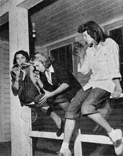 The porch railing is a comfortable place to perch and blow plastic bubbles, From left to right, Joan Gilliam, Mary Lou Miller and Marjorie Curtis huff and they puff. The three are also active in Oak Ridge High's Youth Council on the Atomic Crisis, which crusades for the peaceful use of atomic energy.