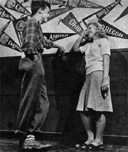 From all over the 48 states have come the Oak Ridge families. Proof is the unique collection of pennants in the Wildcats' Den. The good neighbors are Bill Cobb of Tennessee and Marty Rolfing of Minnesota. Marty wears zomb-ees without ankle socks, a favorite fashion among the girls at Oak Ridge High.