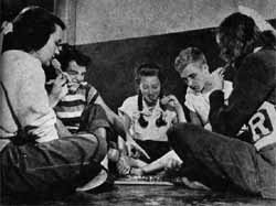The girls steady their nerves with lollipops during a tense game of chinese checkers. Chester Painter (left) has just pulled a boner, and Tommyy Stephenson comments: "That's rare" |