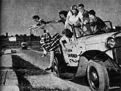 | All out for the Wildcats' Den as Don Riley brings his jalopy, Atom Smasher, to a groaning stop. The girls frown on twosomes, like to travel in packs. "We want fun, not heavy romance," they declare. For fun they often throw hen Slumber Parties, giggle- and gabfests that go on till the tired guests fall asleep on blankets in the living room. | The juke box is neglected as jitterbugs stomp to Pollock's recorded music, piped via telephone wire to the Den from a central broadcasting studio in Oak Ridge. Dancers telephone their requests to Mr. Pollock. Currently they're for Smoke! Smoke! Smoke! (That Cigarette), and Vaughn Monroe's arrangement of Racing with the Moon. | ||