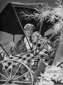 "You see," he caroled happily, "here's where the heater goes. The radio here. And this is the aerial. And look at the fenders. Aren't they dillies?" "Dillies, indeed," she agreed. "It has possibilities, as they say about houses, but there will be a great deal of work to do. An what," she asked, "is your intention regarding this so-called car once you have accomplished making it into a car, which seems doubtful to my dull mind?" Barry folded up his drawings unhappily. It was useless, you couldn't make them see. But he'd show them yet, he would. He lurched out of his chair and regarded the large calendar on the inside of the back door with a calculating eye. "Well," he said, "this is the 18th of October. Our Winter dance at school in son the last day of January, and I'm going to have her in shape for that." "You mean that your infatuation for cars has become so deep that you are taking a Buick to a dance instead of a girl?" Barry looked as scornful as it was possible for anyone with such a short nose to look. "I'm taking the Buick and a girl." "Who?" "Hank." "Hank is short for what? And is there another name?" "Henrietta, of course," said Barry with great patience. "Her last name is Martin and she lives in Westport. Anything else?" he inquired politely. "Yes." His mother replied. "Why is it suddenly necessary to work yourself into a lather to achieve the well-nigh impossible; to furnish a chariot for this particular Cinderella?" Barry inspected his fingernails. "Because," he said "Pete Williams has a model A and it has everything. It has a horn that plays 'How dry I am,' another horn that play 'The Volga Boatmen,' and one that just says 'Beep.' It's got a radio, heater, windshield defroster and seven raccoon tails and an American flag. It's smooth and it's sharp and Hank loves that car like it was her own." "So you wish to produce something dreamier for her to love. But wouldn't it be more sensible to transfer her affections in some way to yourself? I'm sure you are more dependable than that thing in the backyard. After all, if a car breaks down, love can die quickly. Whereas if you break down, you inspire a solicitude that is allegedly akin to love." "That's all too deep for me," said Barry simply. "All I know is that 'that thing in the backyard' is going to be something out of this world when I get done. And Hank is going to fall for it like a tree in a windstorm." In the time that followed, there was a great deal of grease on the bathroom towels and under Barry's fingernails. There was very little homework of an academic nature and there was an unwanted amount of social life in the Whitney's backyard. Nearly every day one or more of Barry's cronies would drive into the yard with bales of sheet metal or stacks of outsize tires stowed in the backs of their jalopies and the thumpings and hammerings from the vicinity of the garage were constant and determined. Finally, the day of the dance arrived and, with his chariot panting to play Cupid in all its fire-engine glory, Barry put the finishing touches on himself. Slicking his hair carefully over his head, he stared benignly at the reflection that stared benignly at him. Satisfied at last that he was a fitly handsome pilot for his handsome car, he stumbled down the kitchen stairs and out the back door. He found his mother standing beside the dreamboat, inspecting it curiously. "Nice," she admitted. "But what about a windshield? Won't it be drafty?" "Couldn't get one," Barry said briefly. "But it's all right. I'm taking a couple of blankets. Besides, the heater works." "Yes, but what chance does it have against all outdoors?" Mrs. Whitney inquired. Barry ignored that one and with an airy, "Guess I'll blow," heaved himself into the homemade seat. "All right," his mother said. "But, Barry, call me when you get to Hank's. Just so I'll know. You can reverse charges." It was two full hours before Barry got a chance to call his mother and when he did, he had all he could do to keep his grief from showing. Everything had gone so beautifully. The dreamboat had actually survived the trip to Westport. With some minor delays, to be sure, but that didn't worry him. What really fouled up the situation was that he found Pete Williams, minus his car, true, but complete with sardonic eye, at Hank's, ready and willing to horn in on Barry's date. "Pete's going to ride over with us," Hank explained. "He's loaned his car to his brother for the night." "Oh, fine," was the best that Barry could muster. Then he went to call his mother. "Mom," Barry said, trying to concentrate on things to be happy about, "I made it. I'm here and we're leaving for the dance. An Mom," he added in a sibilant whisper, "she thinks the dreamboat is wonderful!" "But what took you so long?" Mrs. Whitney wailed. "It's only a half-hour's drive over there and you've been gone two whole hours!" "Flat tires," Barry said loftily. "Nothing much really. Had six." Six flat tires," is mother said weakly. "But Barry, there are only four wheels on the car!" "I know," he replied "Two went flat twice. Look, Mom, I gotta go now." "All right, dear," she said. "Thanks for calling and I hope you won't have any more trouble." But his mother's hope didn't even begin to be a reality. His car died just exactly halfway between Westport and New Canaan at half-past nine that night, and not even the knowing and loving surgical hands that Barry applied could bring it back to life. What Barry would have, in a lighter moment, termed "the snafu" would have been hard enough to bear under normal circumstances, but with Pete Williams - the proud possessor of a car that ran - in tow, his tongue all too ready with venomous barbs, it was hideous in the extreme. "Ah, why don't you get a horse," Pete said bitingly, while Barry was still messing hopefully under the hook. "Or a bicycle built for three. At least we'd get somewhere." Barry was quite beyond answering him. After three-quarters of an hour during which every iota of h