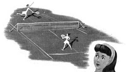 Nancy shrugged. "Sure." But it wasn't O.K. with her. It wasn't O.K. at all. She sat through the games seething inside. She and Harriet had played every morning unless it rained. Nobody else had ever barged in and broken up their game before. Who was this girl anyhow? She wasn't from their school and she didn't live in the neighborhood. When at last the set was over, won by Doris, Nancy stood up stiffly, bouncing a ball with her racket.